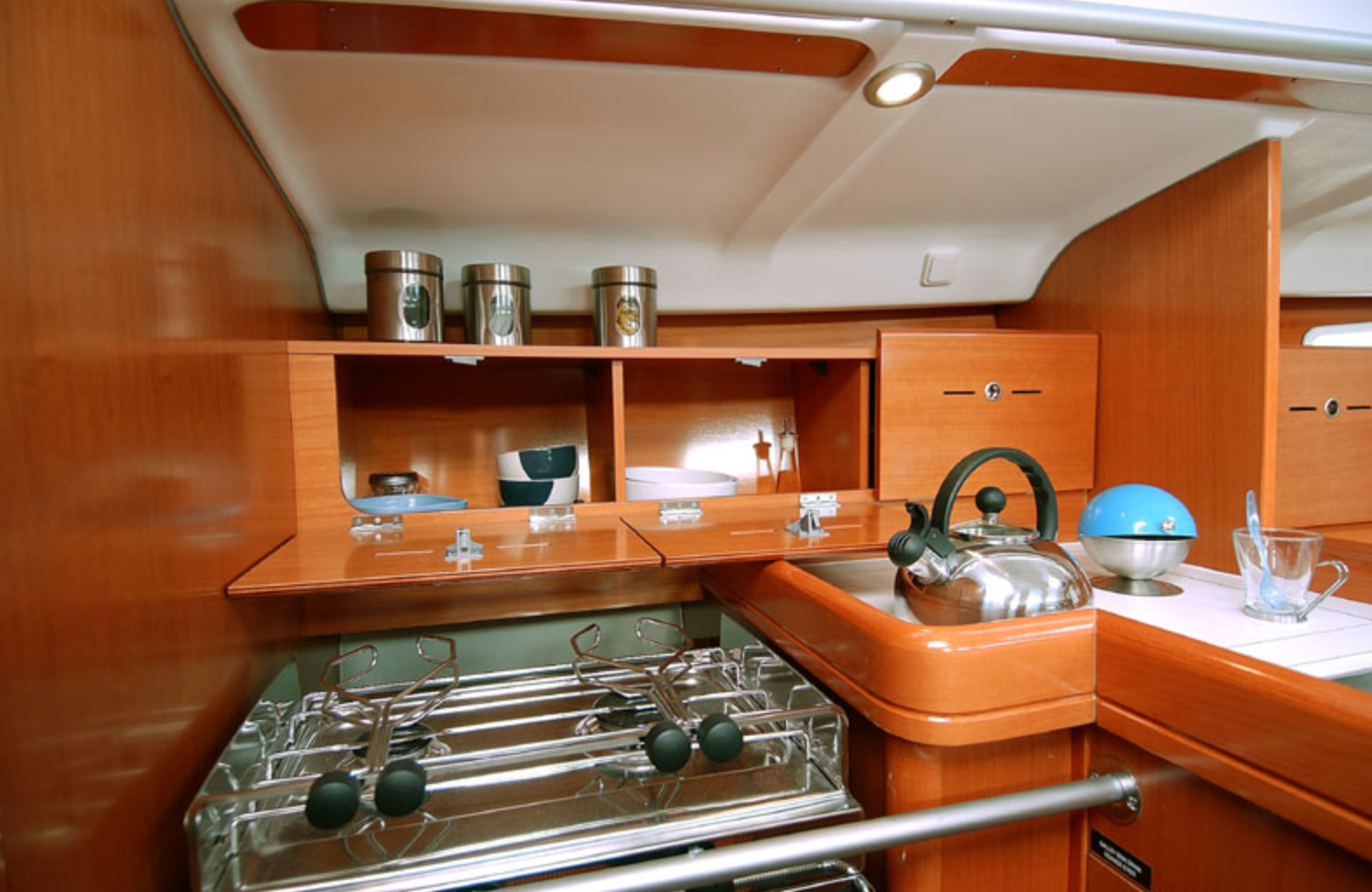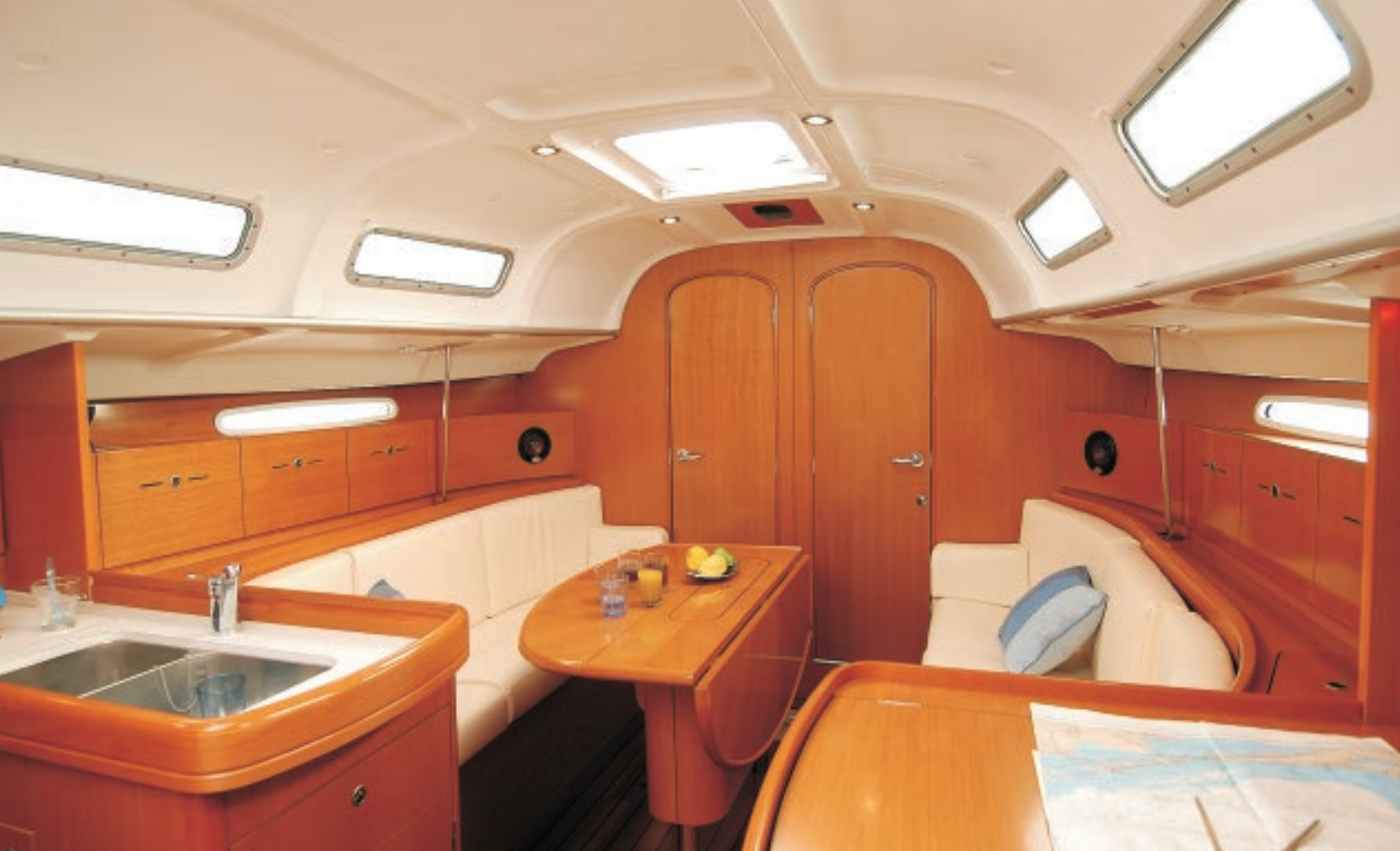Under dekk er det tre doble lugarer, godt utrustet pentry, romslig salong og bad med wc, dusj og servant. Innredningen er i lys eik/ pæretre som gir et lyst og eksklusivt preg.